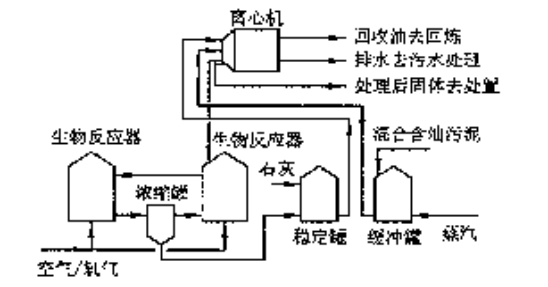 含水50%的泥饼被输送到一台生物反应罐中。罐内通入氧或空气,同时进行机械搅拌,并不断加入氨和磷酸等营养物质,以促进好氧微生物的生长,使其最终转化为二氧化碳和水,处理后的残液进入罐中浓缩,在加入石灰后,再次进行离心脱水,最终泥饼能直接填埋。该技术处理效果好,作业安全(常温常压),经济合理,在提高氧利用率、降低药品消耗和改进泥饼脱油效果等方面仍有降低成本的潜力。