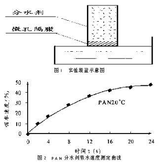 分水剂有较好的粘结性、可塑性和干强度等特点。有研究人员在室内从数十种分水剂中选出三种,按有效性与低成本原则,重点对PAN分水剂作了详细的实验研究。PAN分水剂为晶体层状结构,在吸水时,晶层底面间距加大,使许多水份进入晶体内,起到储存的作用,这部分水在固化过程中参与水化反应,对后期固化物强度做出贡献。PAN分水剂具有分水速度快、吸水量大、体系温度稳定等特点。实验装置如图。吸水速度测定采用称重并计算绘出吸水曲线,体系温度维持在20℃。