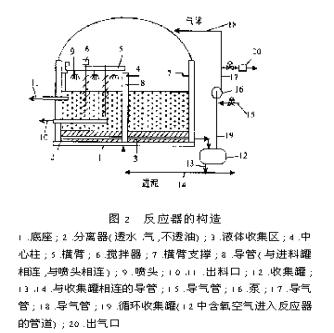反应器的空气循环可通过鼓风机实现,中心鼓风机为微生物氧化废弃物中的有机物提供必要的气流。因为氧气的消耗,在反应器内安装了氧气传感器,检测反应器中氧气浓度。为了平衡空气的进入,反应器上还装有一出气口,出气处装有活性碳滤器,可以捕获到任何可能存在于空气中的有机物。因为空气在反应器中循环使用,反应器也可作为一个降低空气中挥发性有机物的生物滤器。一般情况下,空气从反应器顶部到底部循环,有利于污泥的脱水,但如果需要,正常的向下流动的模式可以翻转,而使反应器床底部干燥。