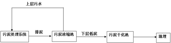 该工艺是一种传统的处理工艺,其工艺流程图如图所示,主要是通过自然沉降去除污泥颗粒间隙中的水,这部分水一般占污泥含水的70%左右,通过浓缩处理可以使含水率降到95%左右,然后将浓缩后的污泥自然风干,填埋。