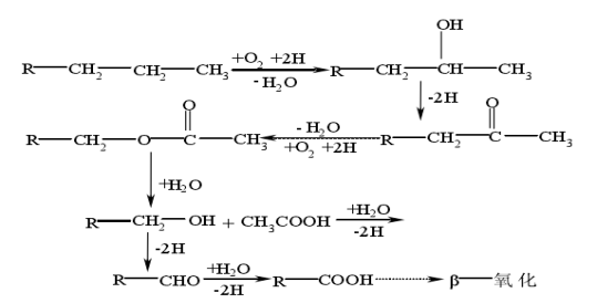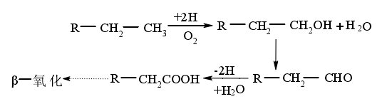 降解途径一:微生物攻击链烷烃末端甲基,由混合功能氧化酶催化氧化成伯醇,再依次进一步被氧化成醛和脂肪酸,脂肪酸再按β-氧化进一步分解。其反应式: