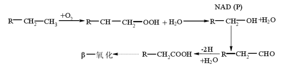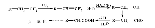 继续氧化成醛、羧酸,羧酸则通过β-氧化进一步代谢。反应式如下: