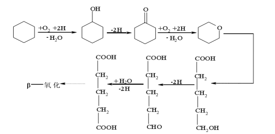 环烷烃在石油馏分中占有较大比例,在环烷烃中又以环己烷和环戊烷为主,没有末端烷基环烷烃,它的生物降解原理和链烷烃的次末端氧化相似。首先混合功能氧化酶(羟化酶)氧化产生环烷醇,然后脱氢得酮,进一步氧化得内酯,或直接开环,生成脂肪酸。以环已烷为例,其生物降解的机制为:混合功能氧化酶的羟化作用生成环已醇,后者脱氢生成酮,再进一步氧化,一个氧插入环而生成内酯,内酯开环,一端的羟基被氧化成醛基,再氧化成羧基,生成的二羧酸通过β-氧化进一步代谢。其反应式如下: