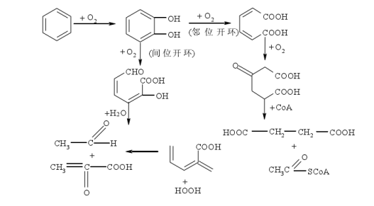 芳香烃是重要的石油组分,是修复土壤污染应优先控制的污染物。其代谢机理为芳香烃由加氧酶氧化为儿茶酚,二羟基化的芳香环再氧化,邻位或间位开环。邻位开环生成已二烯二酸,再氧化为β-酮已二酸,后者再氧化为三羧酸循环的中间产物琥珀酸和乙酰辅酶A。间位开环生成2-羟已二烯半醛酸,进一步代谢生成甲酸、乙醛和丙酮酸。以上反应见下式: