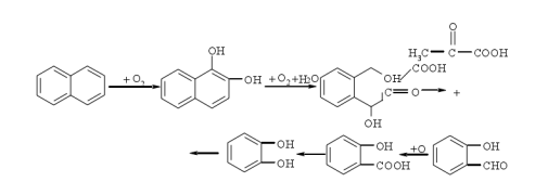 多环芳烃的生物降解,先是一个环二羟基化、开环,进一步降解为丙酮酸和CO2,然后第二个环以同样方式分解。以萘为例:
