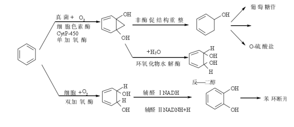 一些学者[5, 6]在研究多环芳烃污染土壤的生物修复,认为其降解过程如下:在多环芳烃等物质的诱导下,微生物可分泌出单加氧酶和双加氧酶,在这些酶的作用下,把氧加到苯环上,形成C-O键,再经过加氢、脱水等作用而使C-C键断裂,使苯环减少。其中真菌产生单加氧酶,加一个氧原子到苯环上,形成环氧化合物,加入H2O产生反式二醇和酚;细菌产生双加氧酶,加双氧原子到苯环上,形成过氧化物,然后氧化成为顺式二醇,脱氢后产生酚。环的氧化是微生物降解多环芳烃的限制步骤,以后降解较快,很少积累中间代谢物,不同的途径有不同的代谢物,但普遍的中间代谢物是邻苯二酚,2,5-二羟基苯甲酸,3,4-二羟基苯甲酸。最终产物是二氧化碳和水。以一个苯环为例,其代谢示意图如下: