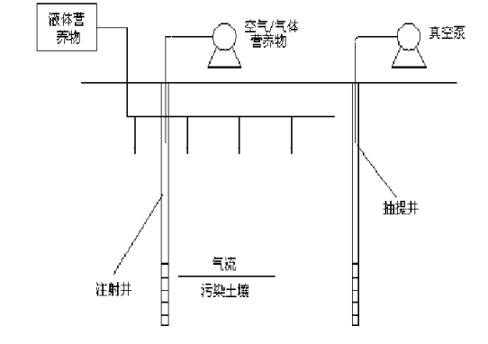 (3)生物通气法(Bioventing):该方法是一种原位生物修复技术,它是从土壤气相抽提技术(SoilVaporExtraction.SVE)中衍生出来的,它结合了原位气相抽提与原位生物降解的特点,是一种强迫氧化的微生物降解技术[14, 15]。在待治理的土壤中打至少两口井,安装鼓风机和抽真空机,将空气(空气中加入氮、磷等营养元素,为土壤降解菌提供营养物质)强行注入土壤中,然后抽出,土壤中挥发性的毒物也随之去除。大部分低沸点、易挥发的有机物直接随空气一起抽出,而高沸点重组分的有机物主要是在微生物的作用下,被彻底矿化为二氧化碳和水。在抽提过程中不断加入新鲜氧,有助于降解残余的有机物,如石油中沸点高、分子量大的物质。其原理示意图如图1-2。